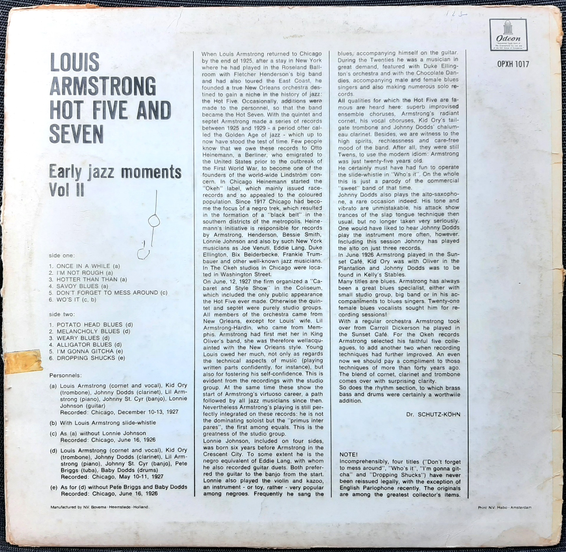 Louis Armstrong. Hot five and seven. Titel: Early jazz moments vol 2. Platenlabel: Odeon records. Code: OPXH 1017. Jaartal onbekend.