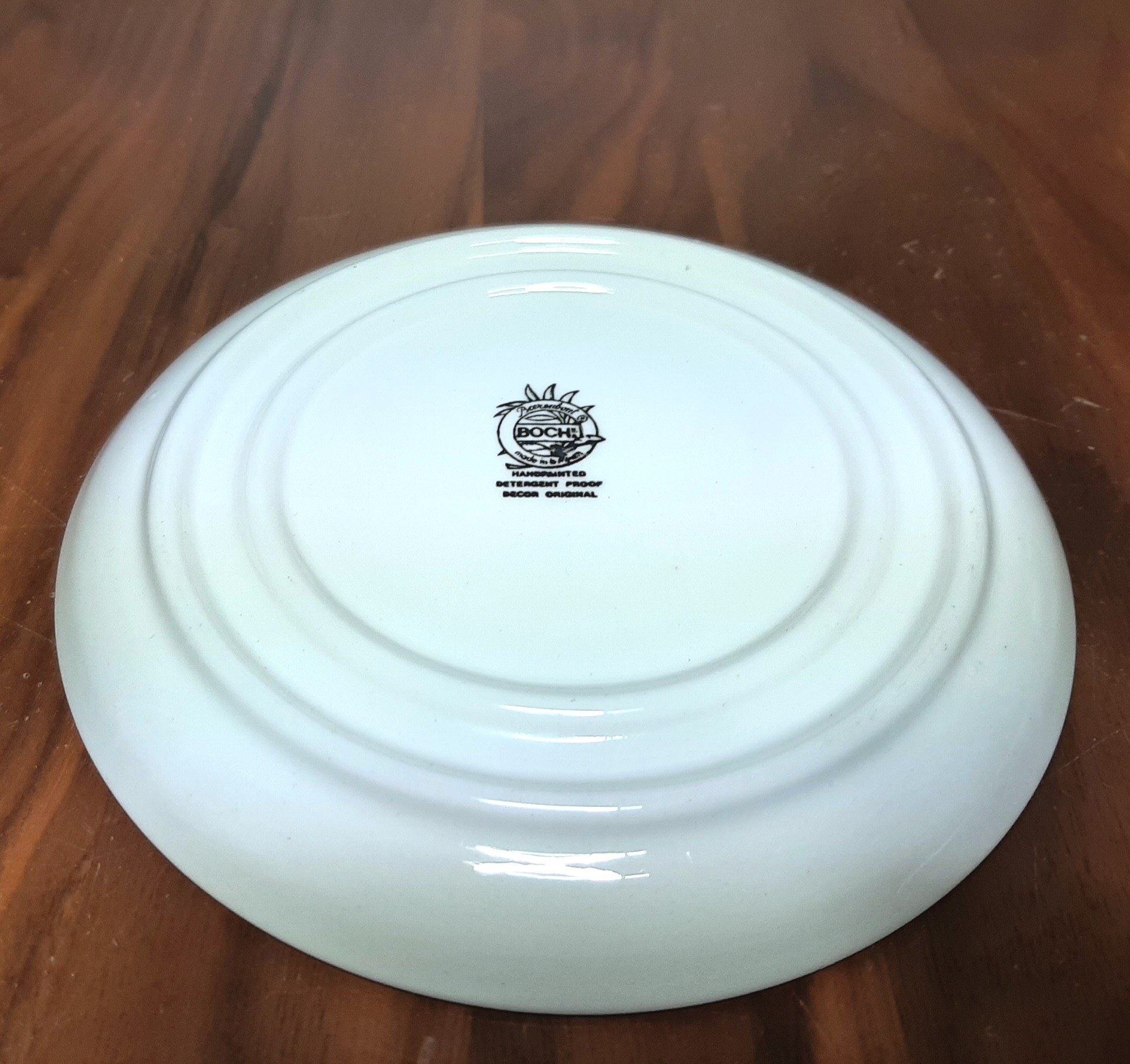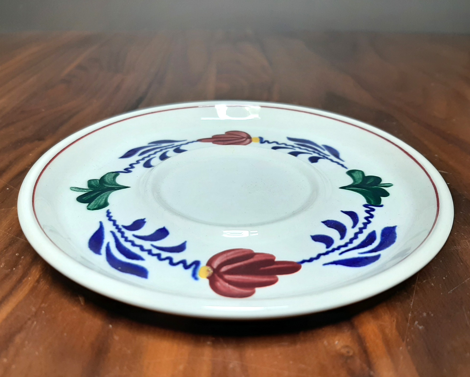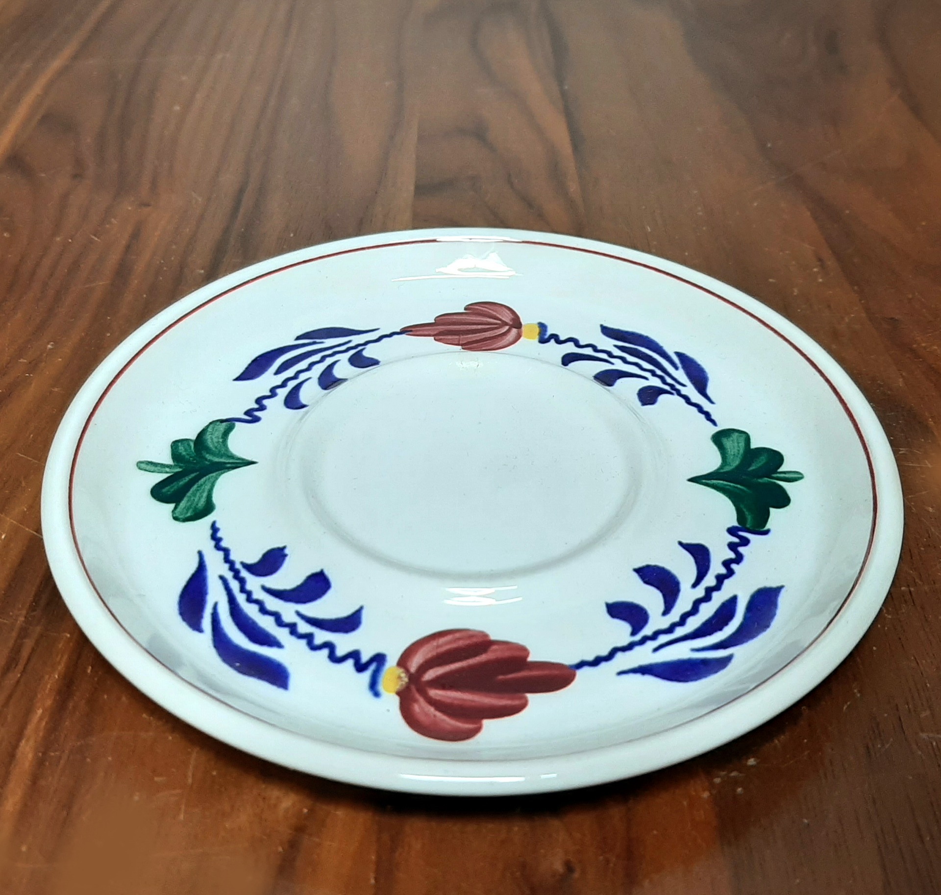 Schoteltje 3. Boerenbont. Made by BOCH Belgium. Een kleiner formaat schoteltje voor koffiekopjes. Doorsnede: 14,5 cm. Diverse stuks te bestellen.