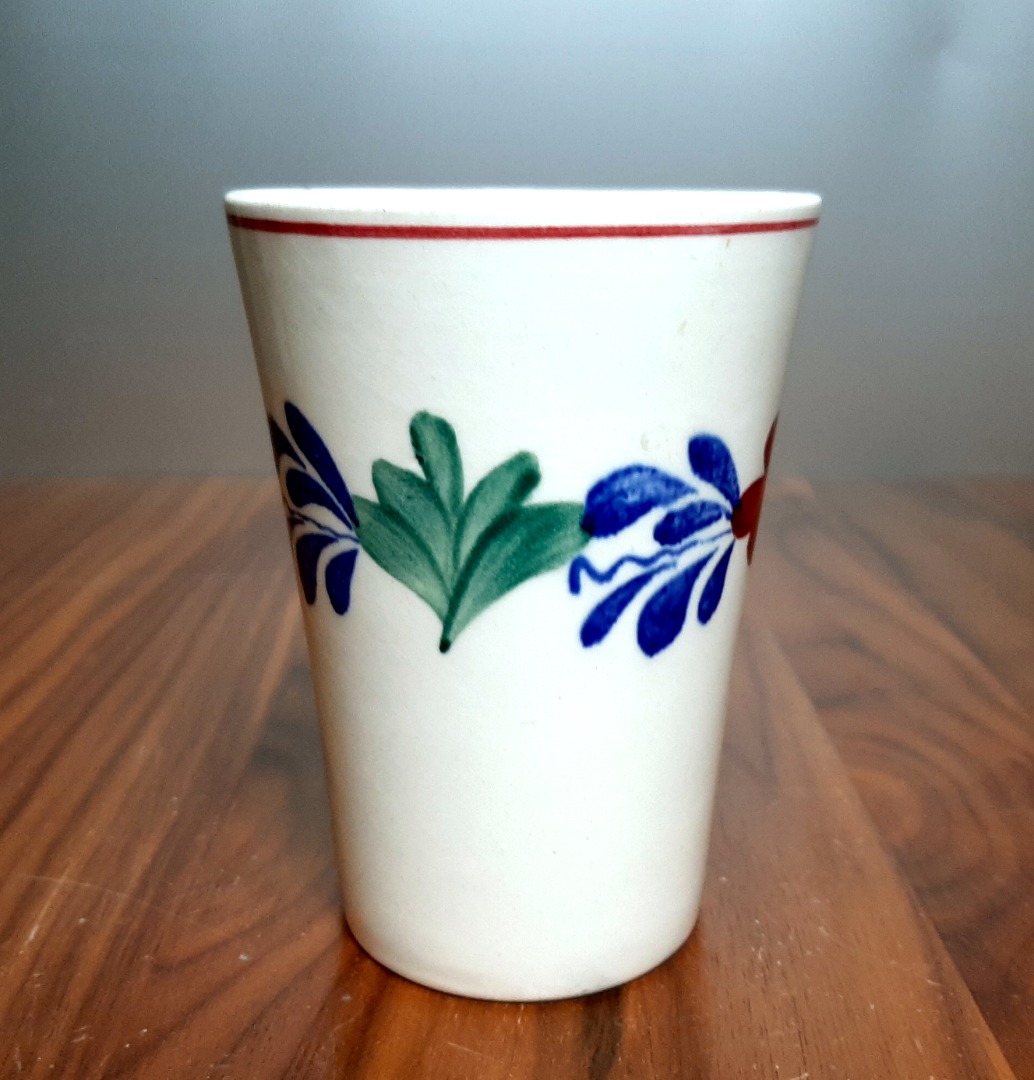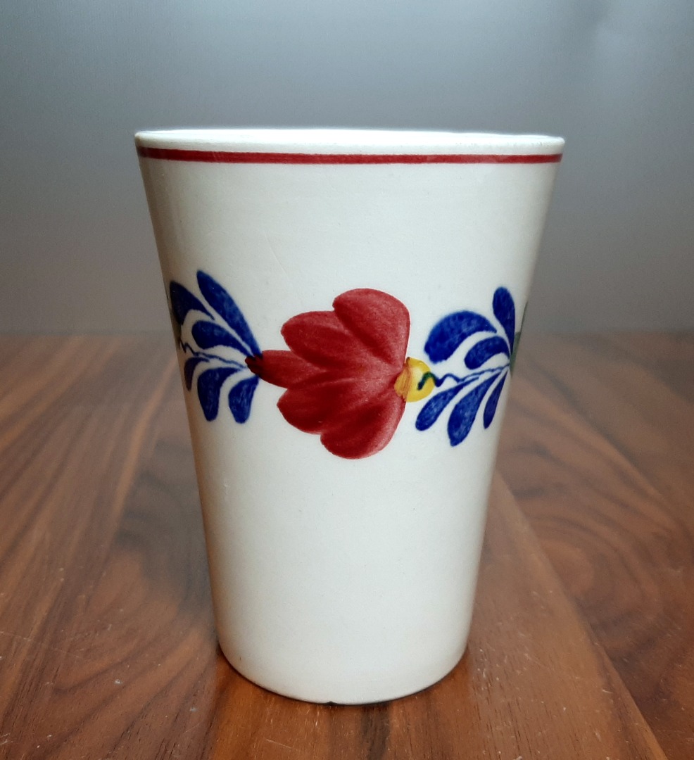 Beker. Boerenbont. Made by Sphinx. Doorsnede: 7,7 cm. x hoogte 10,4 cm. Een verkrijgbaar. (Er is een klein chipje af)