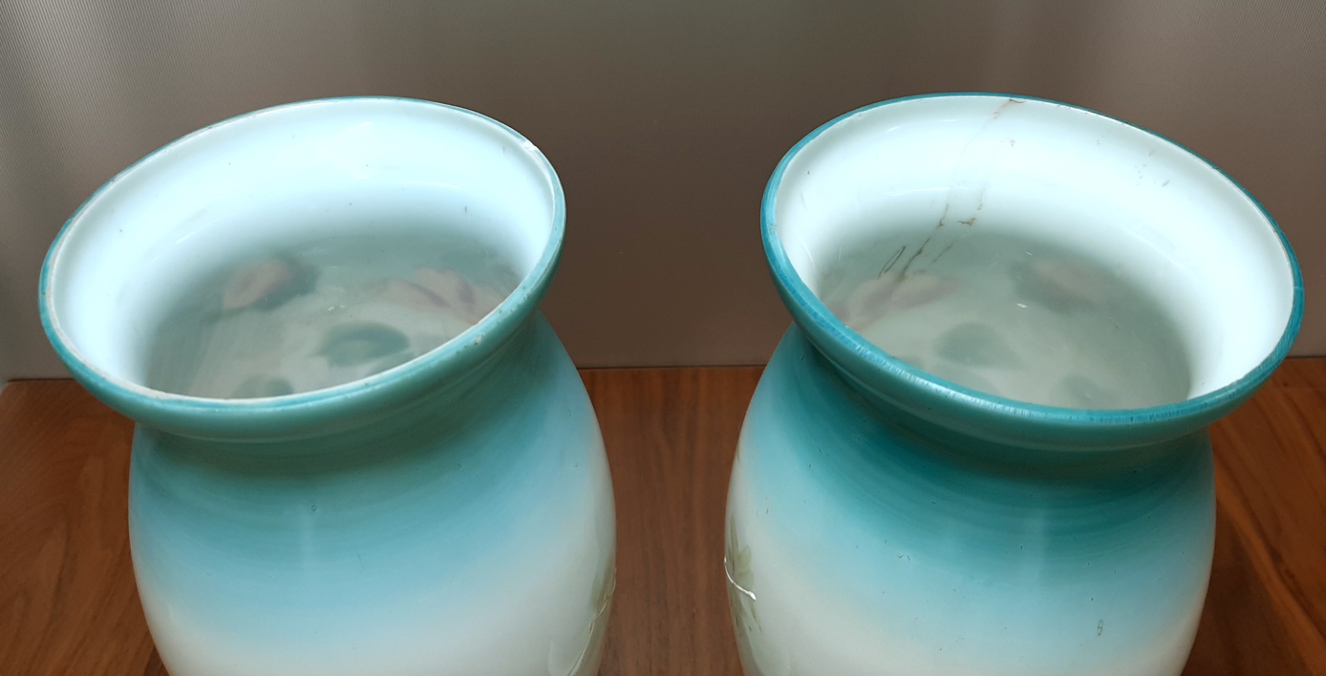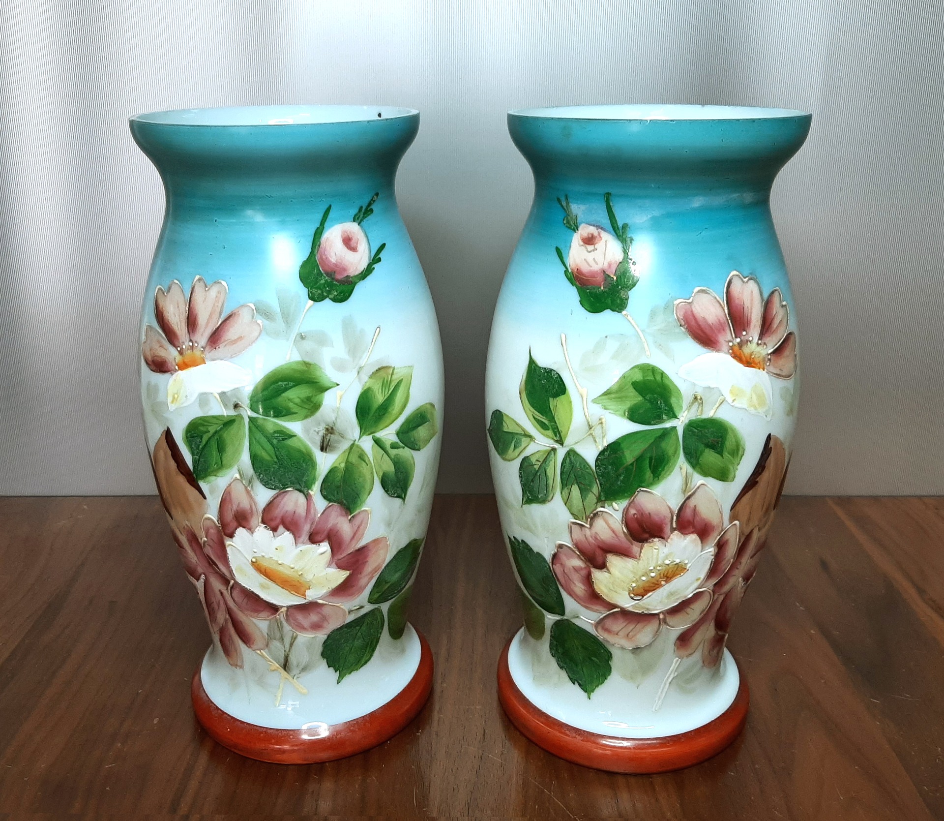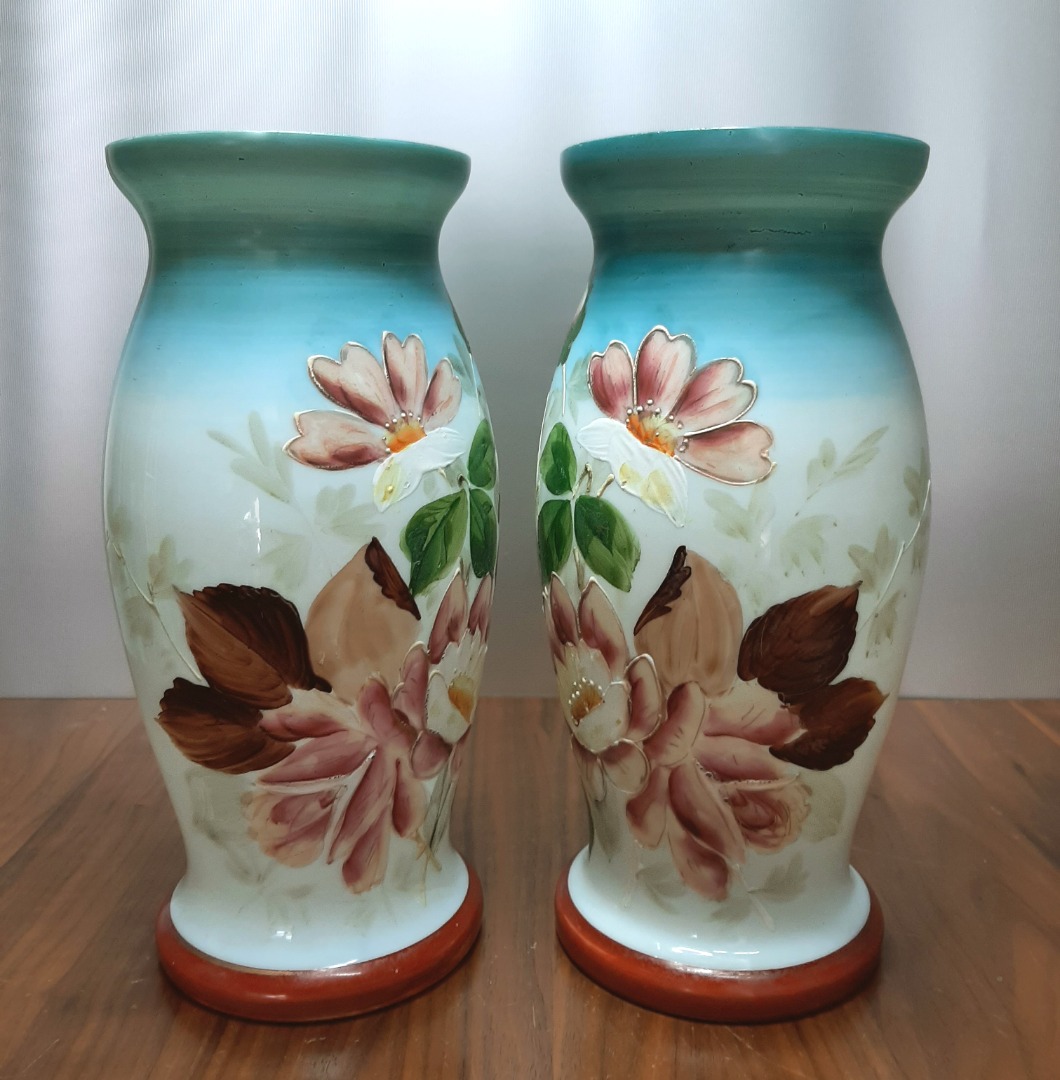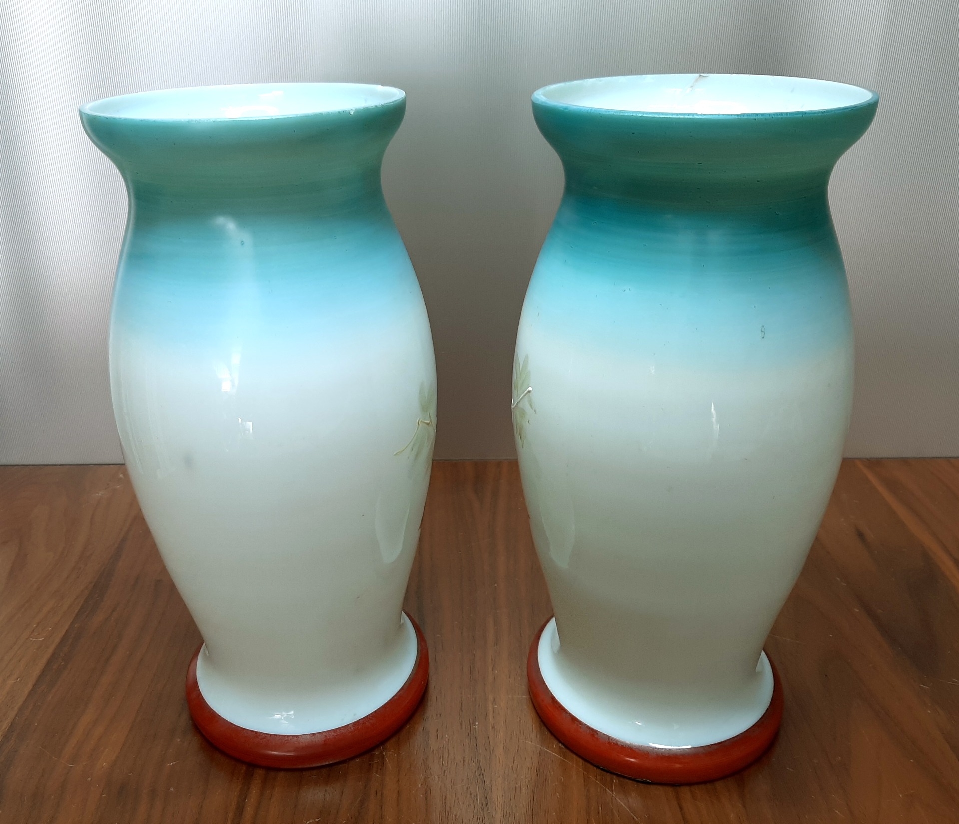Twee glazen siervazen. Een set van twee prachtige oude siervazen uit grootmoeders tijd. De vazen zijn 26,5 cm. hoog en hebben een doorsnede van ongeveer 12 cm. Deze vazen hebben wel gebruiksporen. Aan een bovenzijde is een klein chipje af en in de andere vaas zit een haarscheurtje.