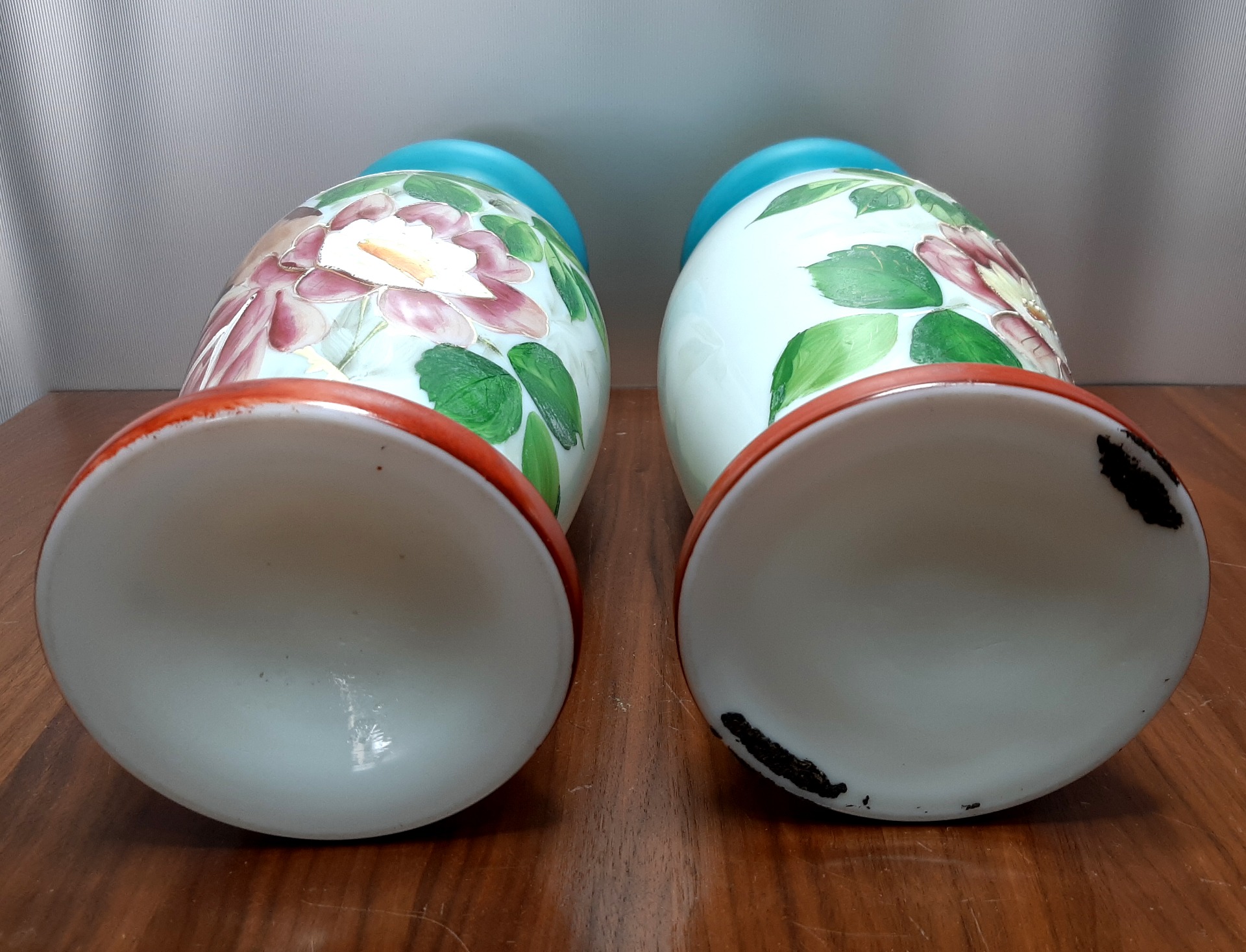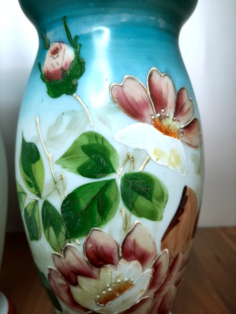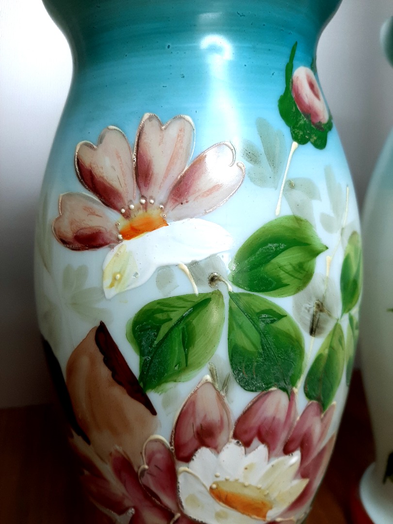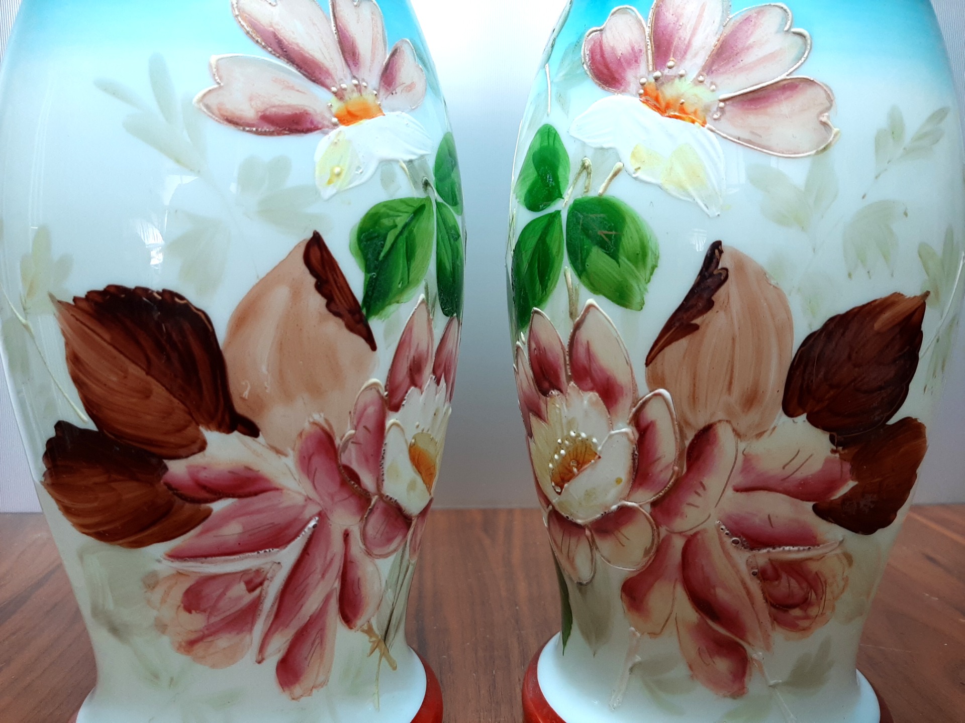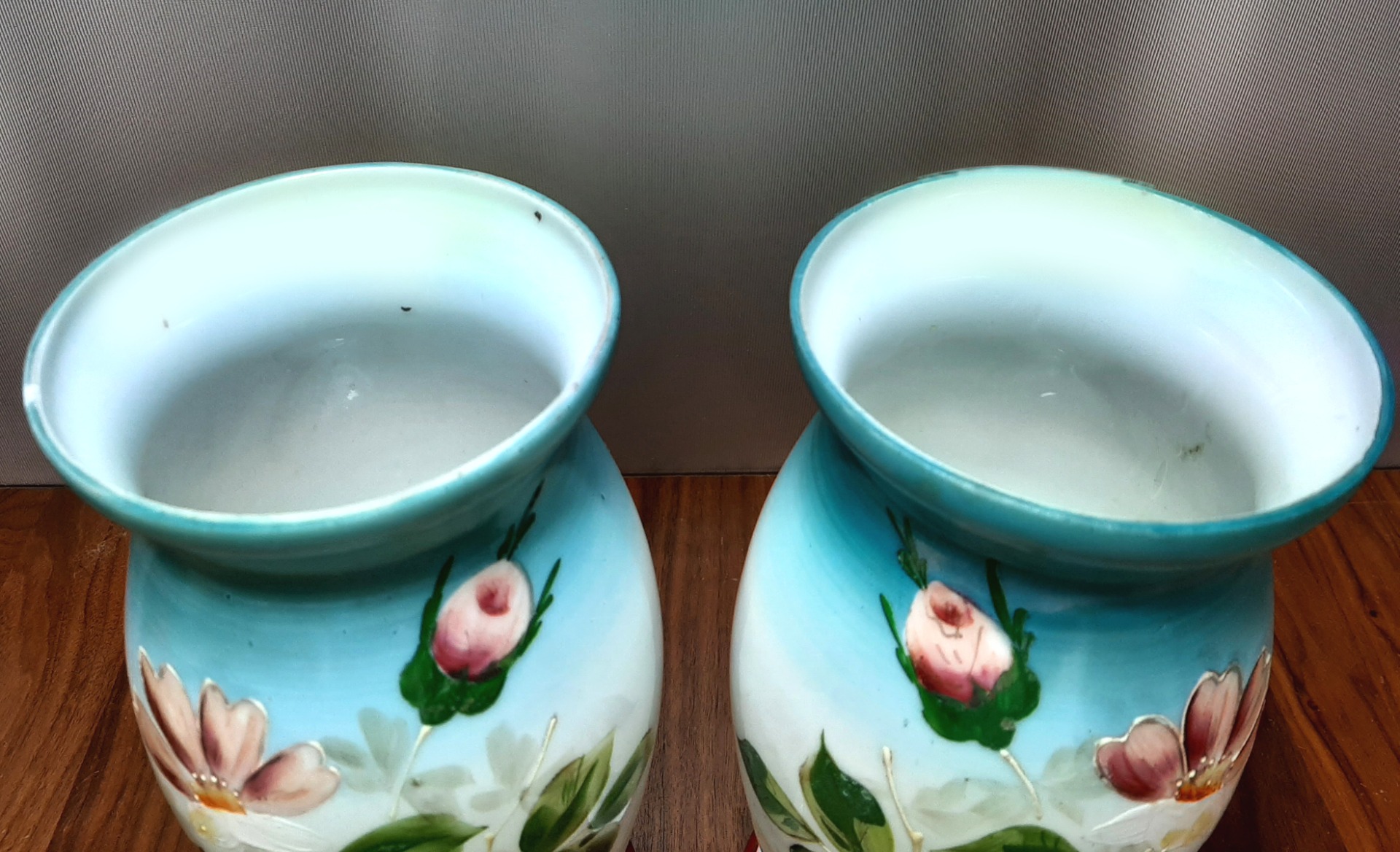 Twee glazen siervazen. Een set van twee prachtige oude siervazen uit grootmoeders tijd. De vazen zijn 26,5 cm. hoog en hebben een doorsnede van ongeveer 12 cm. Deze vazen hebben wel gebruiksporen. Aan een bovenzijde is een klein chipje af en in de andere vaas zit een haarscheurtje.