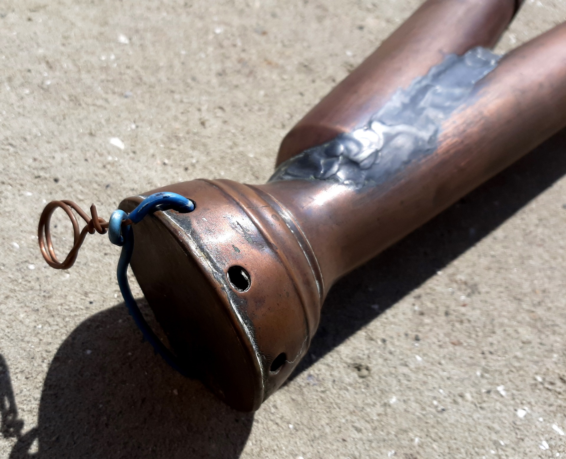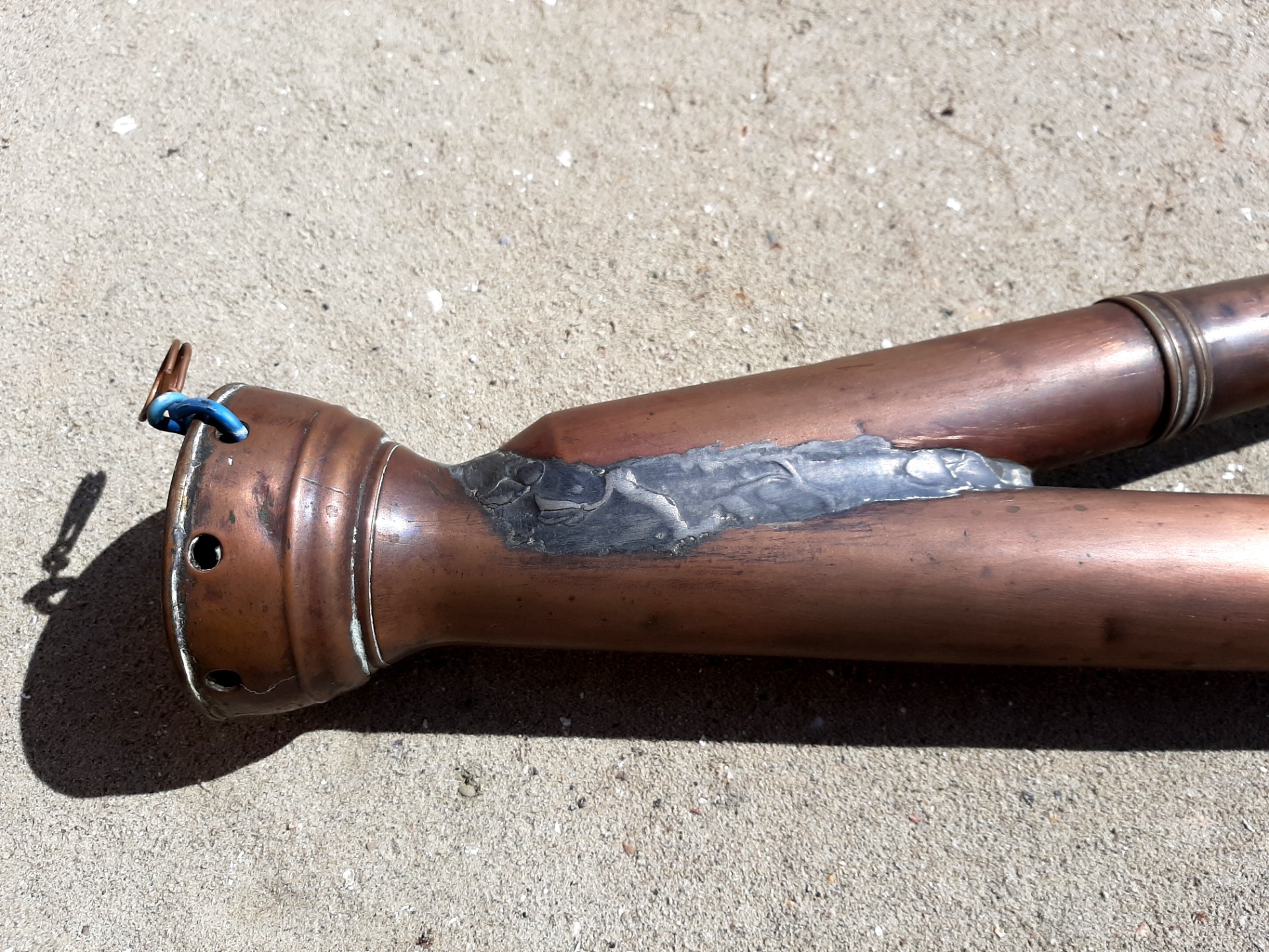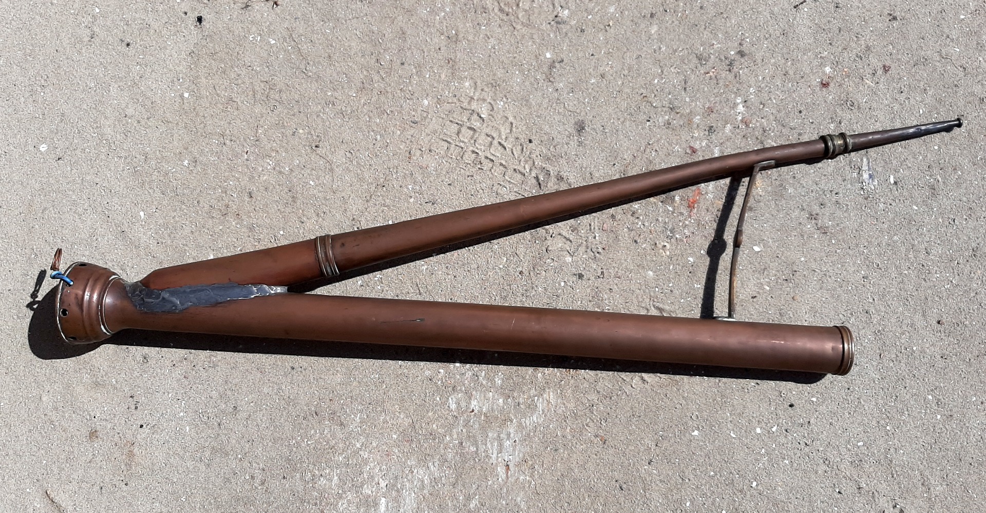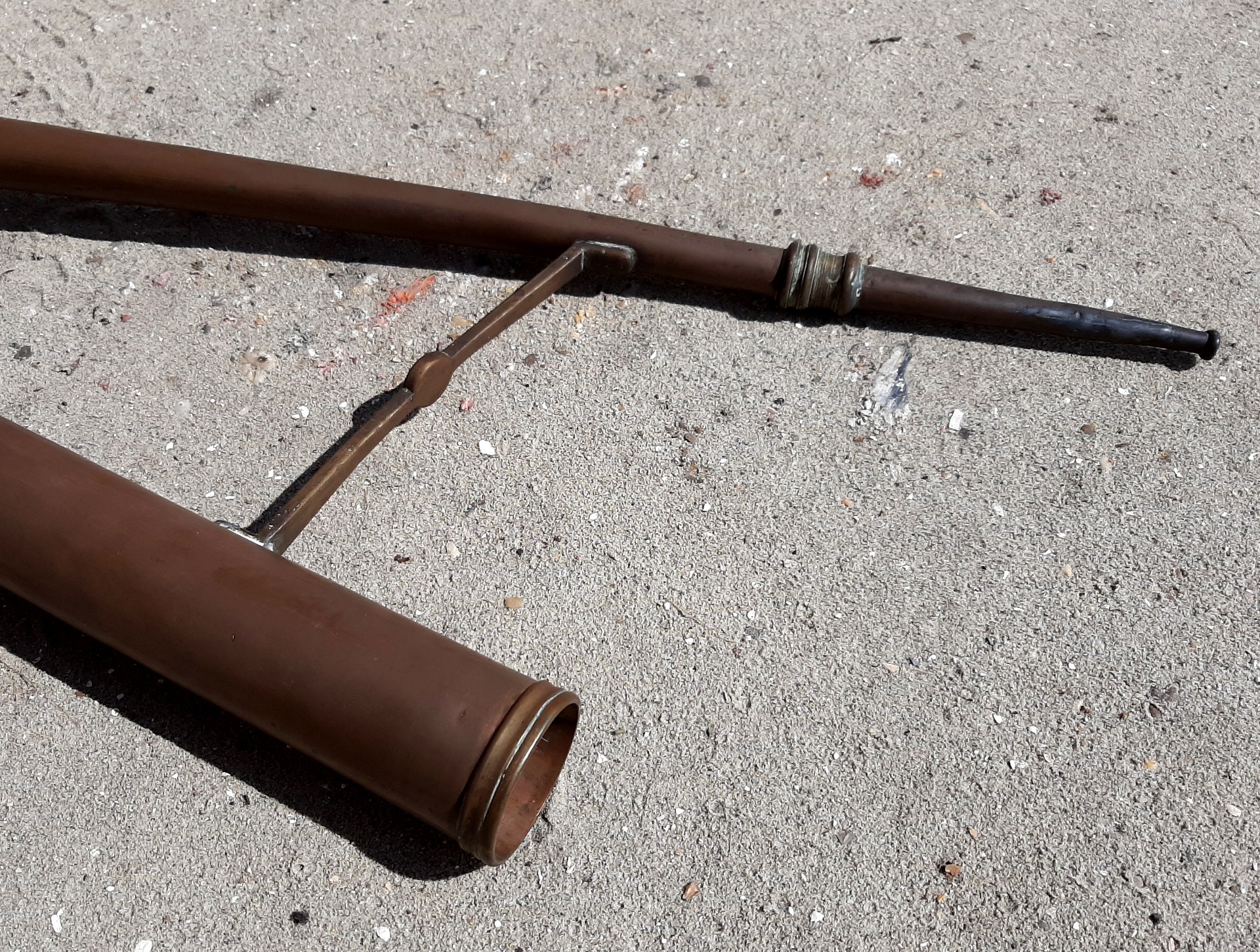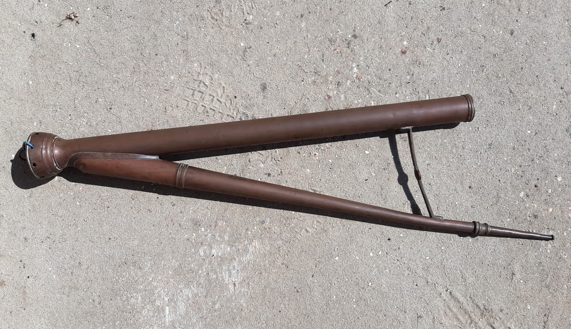 Antieke glazenspuit. De koperen dop ontbreekt helaas. Afmetingen: De buis is 74 cm. lang. De smalle pijp is 89 cm. lang Het totaalgewicht is 1,5 kg.