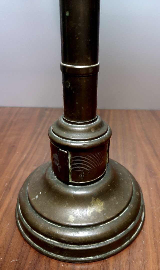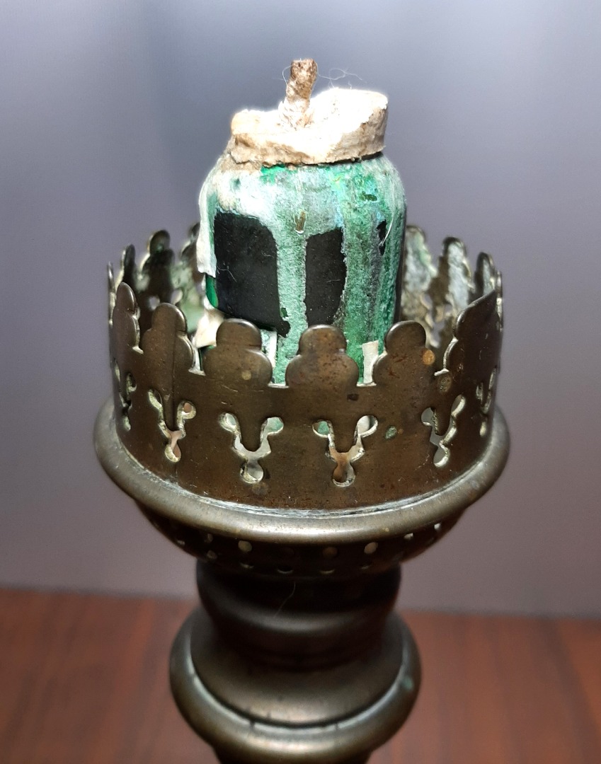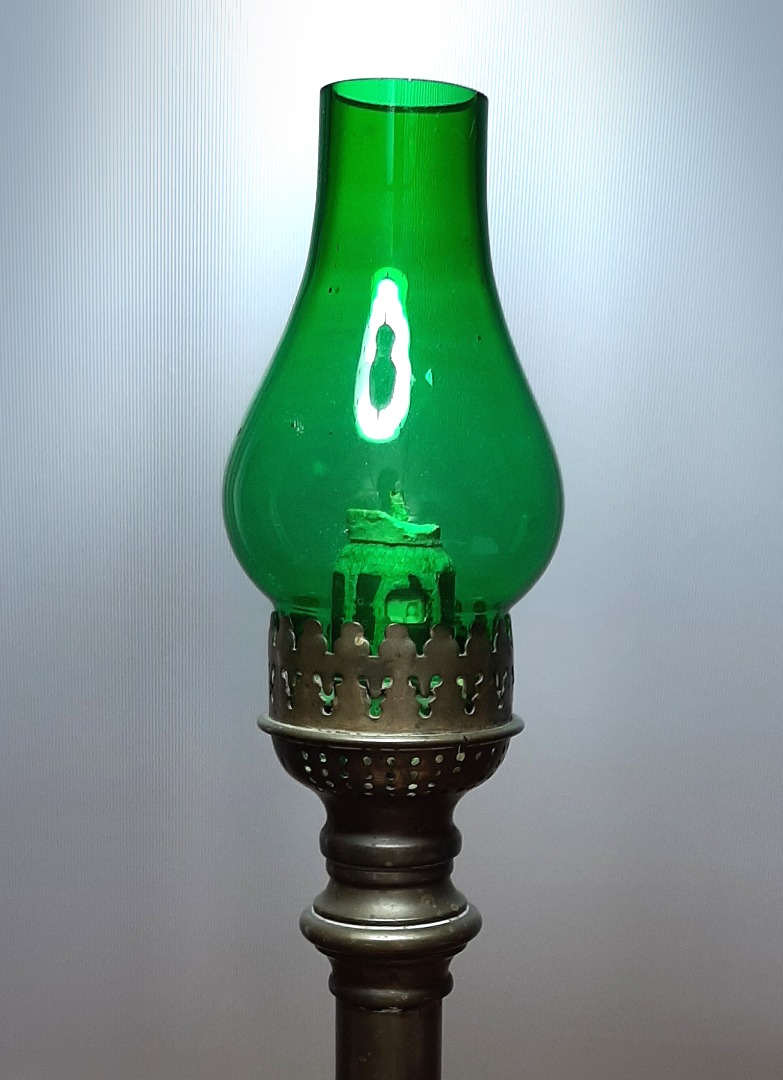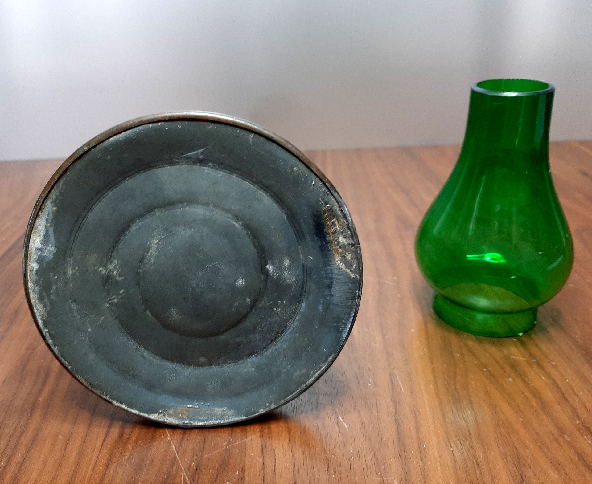 Messing kaarslamp. Een fraaie messing kaarslamp met een groen glazen buisje. Afmetingen: 37 cm. hoog en de voet heeft een doorsnede van 12 cm.
