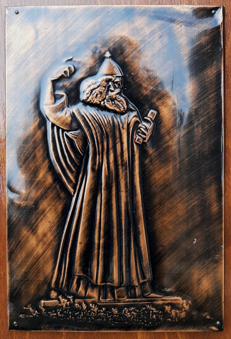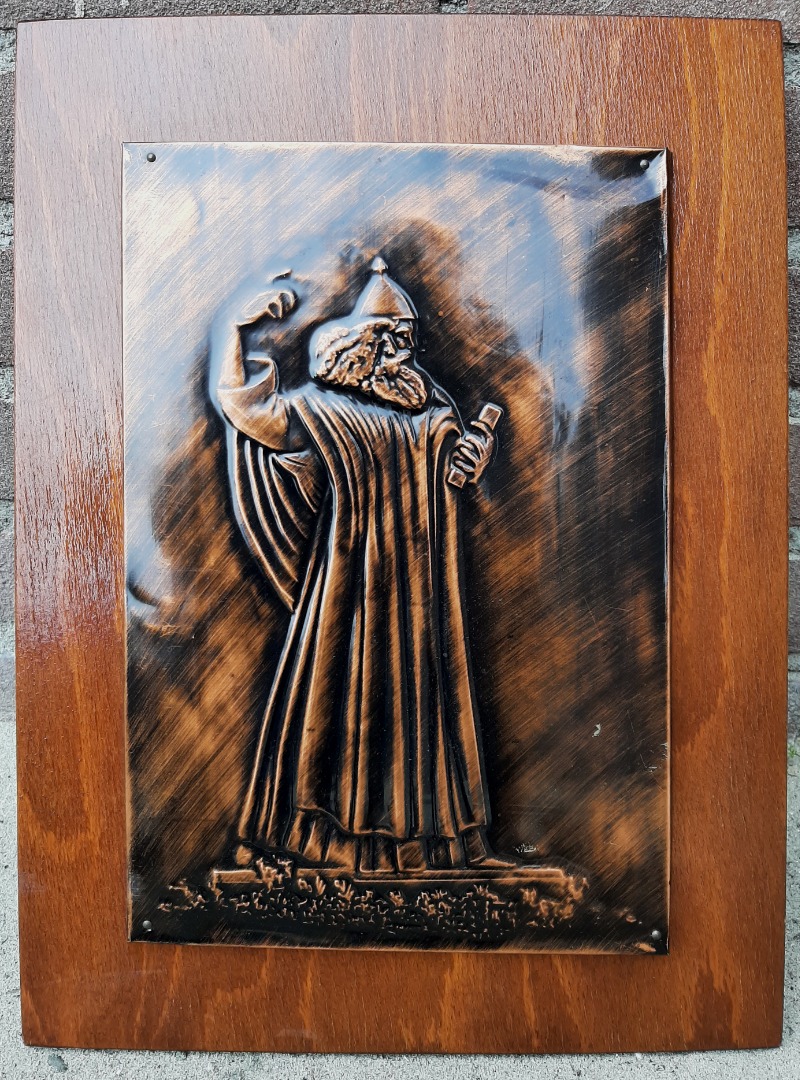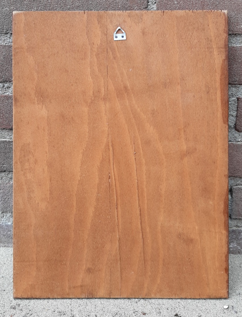 Wanddecoratie. Een vintage wanddecoratie van hout met metaal met een koper look. Afmetingen: 36 cm. x 26 cm.