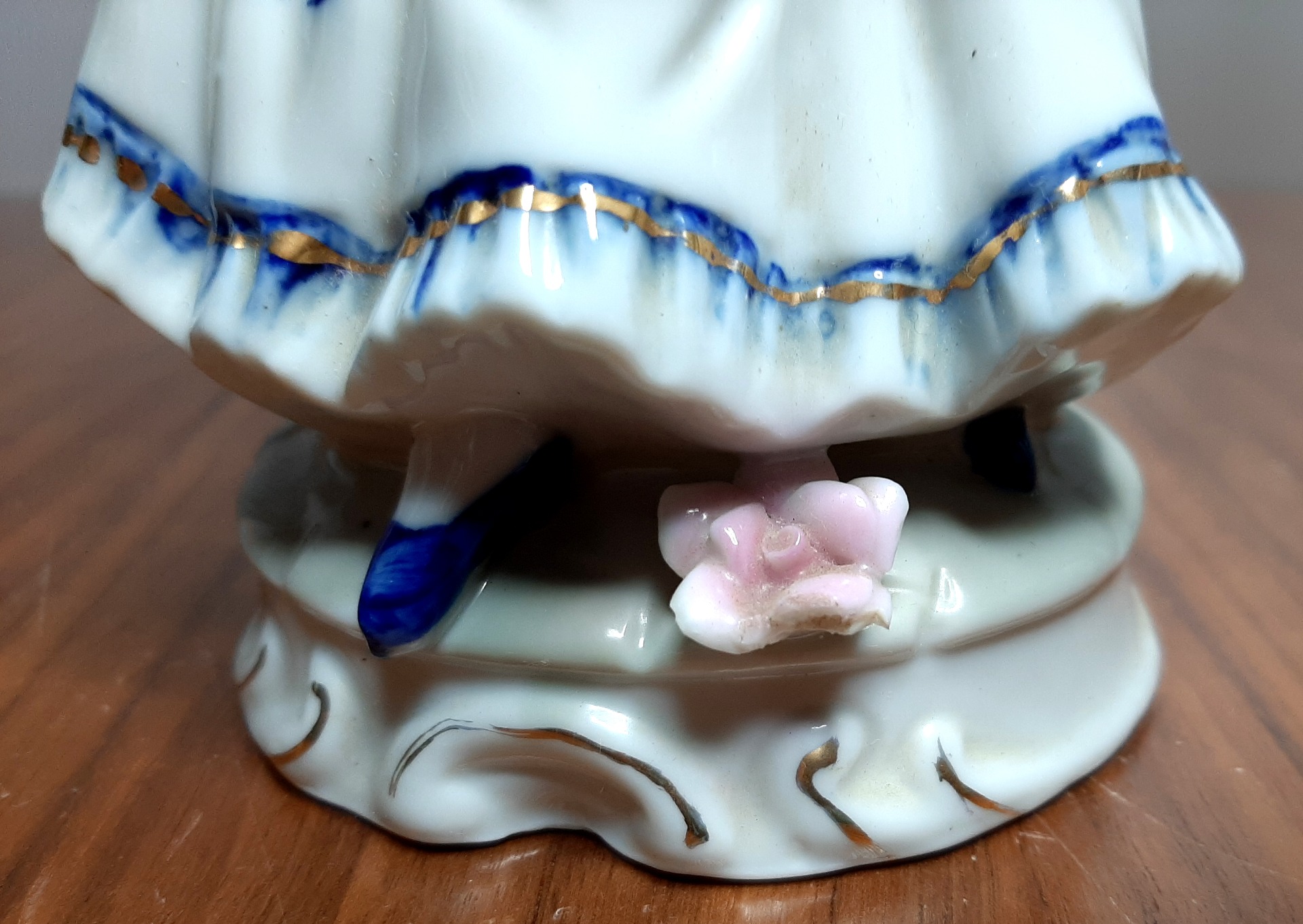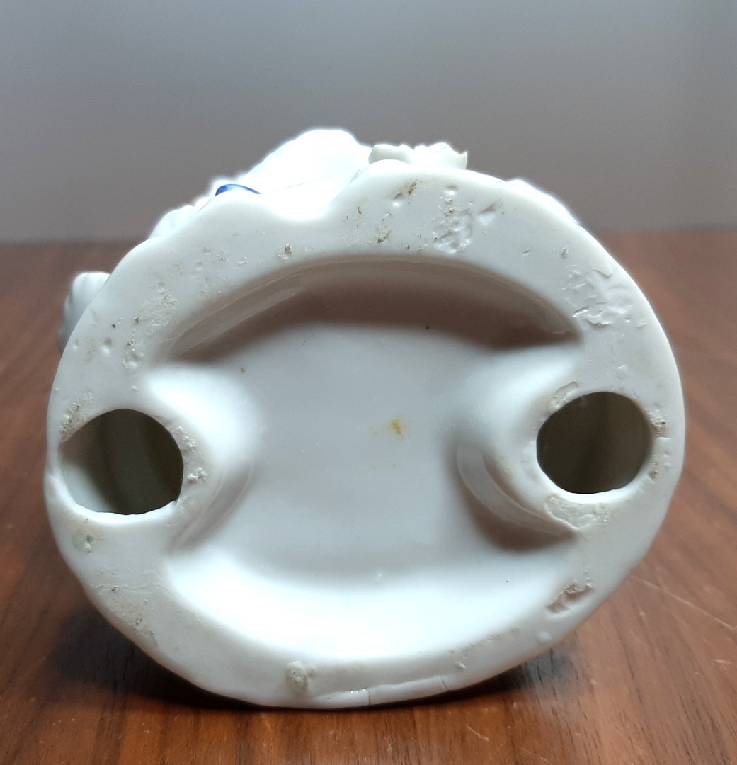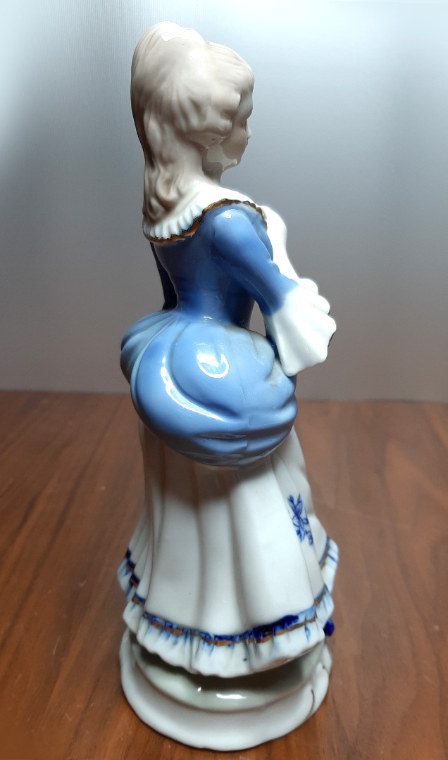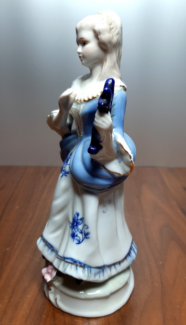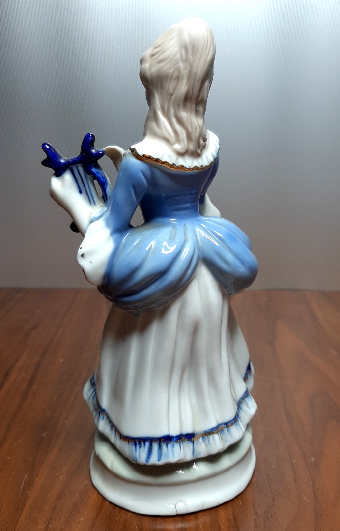 Staand beeldje vrouw. Een fraai porselein beeldje met een vrouwenfiguur met harp. Totale hoogte: 21,5 cm. Onderin een kleine beschadiging.